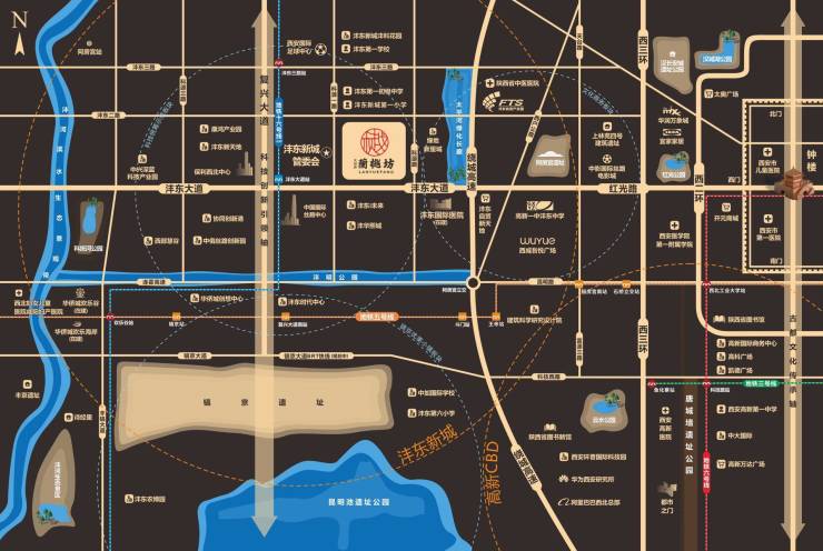 三横三纵立体交通网络,距阿房宫立交约5分钟车程,到高新约25分钟,曲江绕城口约30分钟,到咸阳世界机场约35分钟。地铁:距项目西侧约800米地铁16号线沣东大路站,现在在建中,2023年一期工程通车。向南一站路在华裔城欢乐谷站可换成地铁5号线公里,可在南稍门站换乘2号线号线号线月份试运行;